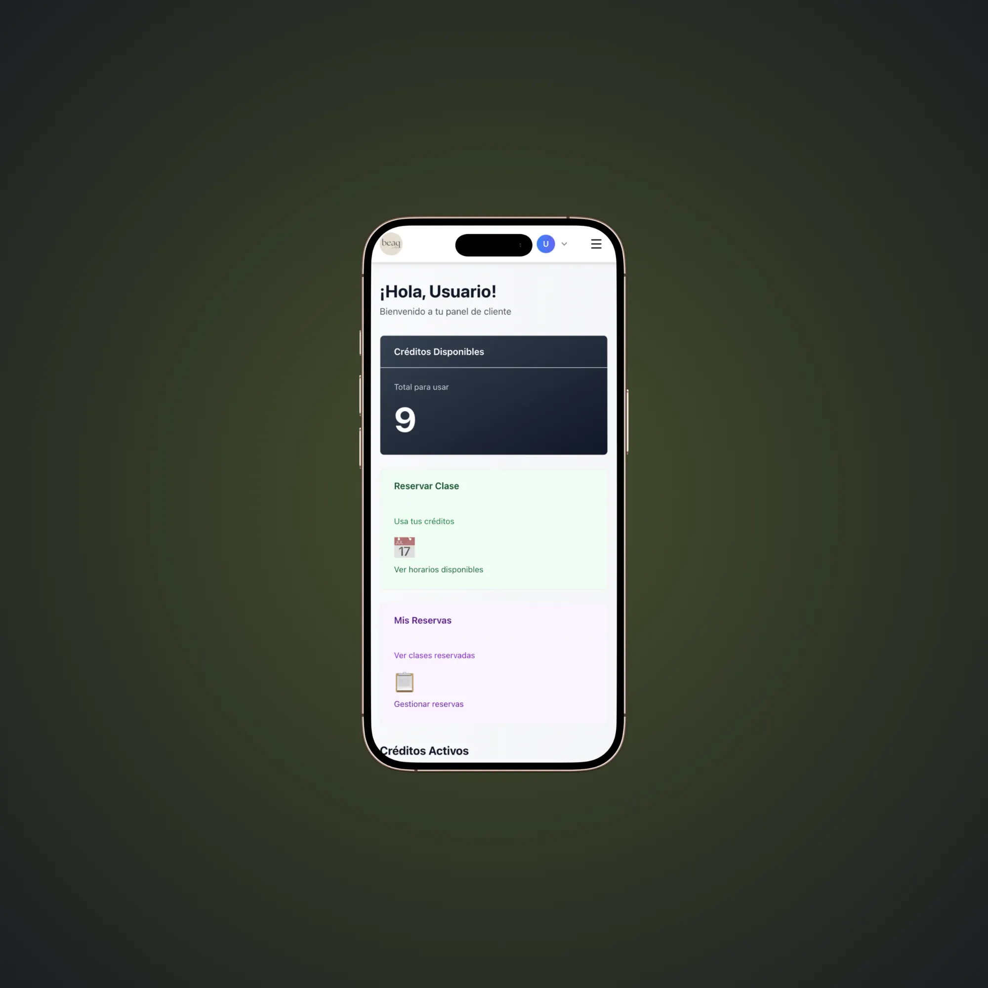 Tus clientes pueden ver sus créditos, reservar clases y ver su historial desde una interfaz móvil intuitiva.